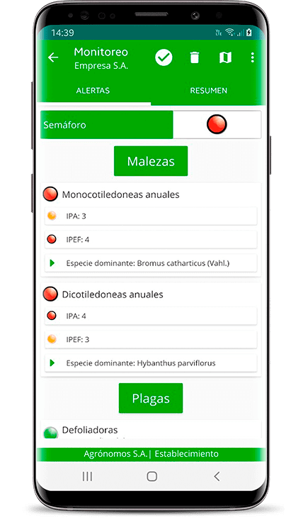 Lleva de manera offline la descripción, fotos, protocolos y umbrales de las adversidades (plagas, malezas y enfermedades) de cada cultivo y registra las mismas con la posibilidad de georefenciarlas y completar tu monitoreo con fotos, videos, audios y notas.